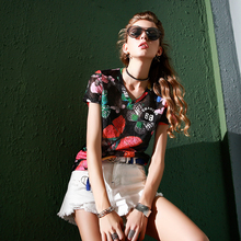原点范欧洲站2017夏季新款印花色蝴蝶T恤女短袖网纱V领体恤女5057
