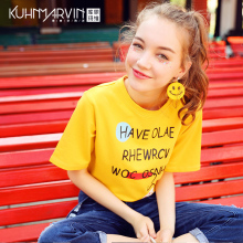 2017夏装新款女装t恤女短袖休闲圆领宽松字母印花黄色上衣打底衫