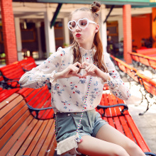 2017春夏季新款甜美学院风木耳边小立领印花雪纺衫女长袖碎花上衣