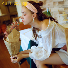 2017夏季新款女装甜美木耳边一字领露肩灯笼袖学生雪纺衫长袖上衣
