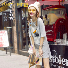 2017春夏新款休闲直筒卡通字母印花七分中袖圆领红色A字连衣裙女
