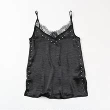 原 2017年春夏 睫毛蕾丝拼接 缎面质感定位手工铆钉吊带/小背心