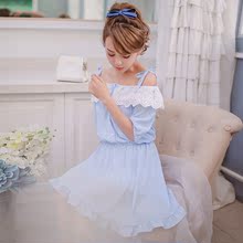 秋千梦 甜美淑女2017夏装吊带漏肩一字领蕾丝雪纺泡泡短袖连衣裙
