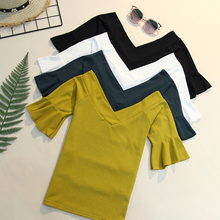 气质v领修身套头喇叭袖T恤女夏简约纯色学生百搭时尚打底衫上衣女