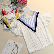 夏季新款韩版气质v领条纹拼接蕾丝衫短袖t恤百搭女学生套头上衣潮