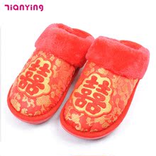 结婚婚庆拖鞋喜庆棉拖鞋 居家情侣拖鞋卡通刺绣拖鞋春秋地板拖鞋