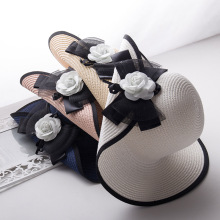 春夏大檐女帽沙滩帽凉帽草帽旅游帽遮阳帽防紫外线黑包边大沿花朵