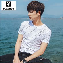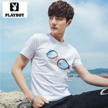花花公子2017 夏季新款 修身圆领短袖T恤 青年印花 图案半截袖潮