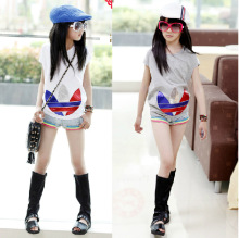 韩版童裤女童夏装2017新款条纹热裤子女大童中腰短袖T恤热裤套装