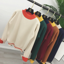 秋冬季新款韩版简约百搭圆领拼色宽松打底毛衣长袖开叉针织衫女潮