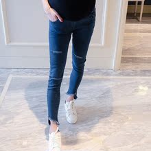 孕妇春季新款韩版破铜长裤孕妇2017纯色修身托腹时尚小脚牛仔裤潮