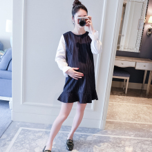 孕妇2017春季新款韩版假两件上衣孕妇条纹中长款荷叶边长袖连衣裙
