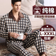 男士睡衣春秋纯棉长袖加厚秋季冬季夹棉夹层大码男中年家居服男装