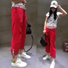 侧边条纹牛仔裤女春夏季2017新款松紧腰宽松休闲七分裤小脚哈伦裤