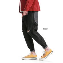 破洞拼接 原创潮男欧美街头复古黑色牛仔裤 休闲长裤子小脚哈伦裤