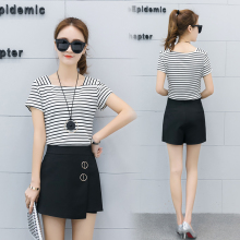 2017夏季新款韩版女装条纹短袖t恤两件套显瘦休闲短裙裤休闲套装