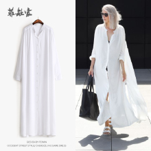自制欧美街衬衫连衣裙长款宽松大码休闲百搭女装长袖衬衫裙夏新品