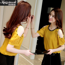 短袖雪纺衫2017夏装新款大码女装性感露肩上衣压皱百搭显瘦半袖女