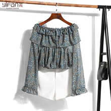 雪纺衫短袖2017夏季新款甜美荷叶边吊带一字肩露肩显瘦碎花上衣女