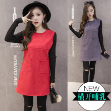 孕妇装打底衫哺乳上衣2017春秋季新款外出哺乳连衣裙马甲两件套潮