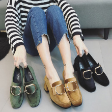2017春季新款方头玛丽珍鞋女韩版一字扣带浅口高跟鞋绒面粗跟单鞋