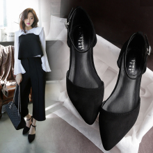 2017春秋韩版新品单鞋女一字扣带尖头镂空平底浅口黑色绒面女单鞋