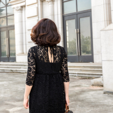 大脸猫 高端中长款七分袖两件套高腰显瘦蕾丝连衣裙 气质长裙夏