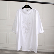 韩版2017夏季新款圆领刺绣米奇中长款短袖T恤割破洞个性纯棉女潮
