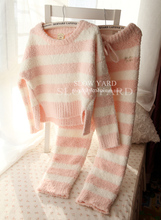 日系 软绵绵秋冬睡衣女 圆领套头家居服套装 淡淡粉白条纹 SW02