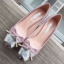 包邮高跟鞋女秋新款金属方头鞋甜美蝴蝶结方头单鞋女浅口粗高跟鞋