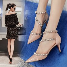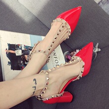 铆钉高跟鞋尖头鞋女粗跟2017春夏新款性感一字扣带粗跟单鞋女高跟