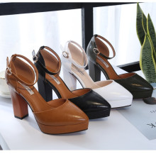 欧美潮2017早春新款粗跟单鞋高跟鞋防水台一字扣尖头浅口中空女鞋
