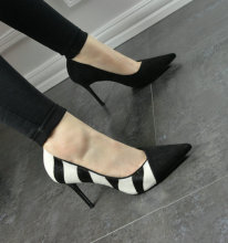欧洲站早春条纹拼色尖头细跟绒面马毛拼接2017早春新款女单鞋高跟
