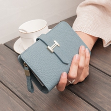 2017新欧美风三折H扣抽带真皮短款钱包女 头层牛皮潮皮夹卡零钱包