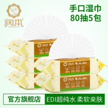 润本婴儿湿巾 宝宝手口湿纸巾 湿巾特惠装便携带盖80抽*5包
