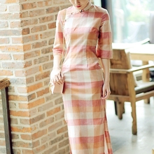 唐之语/新品棉质复古中长款六分装袖中长袖初春格子旗袍裙 酡颜