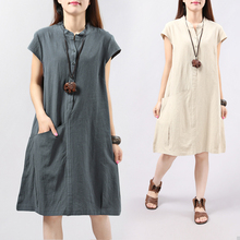 2017夏季新款女装复古文艺韩版大码宽松显瘦短袖中长款棉麻连衣裙