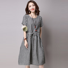 2016夏新款韩版大码女装中长宽松格子系带棉麻A字裙短袖连衣裙女