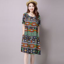 2016夏新款民族风大码女装中长复古印花花色A字裙短袖棉麻连衣裙