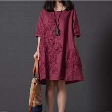 2016夏季新款棉麻女装宽松韩版复古绣花中长款大码圆领短袖连衣裙