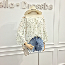 森女风小清新碎花雪纺衫 甜美露肩一字领肩喇叭袖宽松雪纺衫