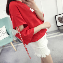 袖子破洞T恤衫女短袖2017春夏装新款女装韩版宽松字母印花体恤衫