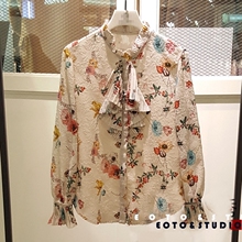 2017春装新款喇叭袖荷叶领雪纺衬衫女长袖碎花衬衣上衣C164MSC044