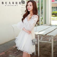 蕾丝连衣裙 粉红大布娃娃 春季新品 白色修身长袖高腰网纱蓬蓬裙