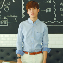 MUT春季条纹男士长袖衬衫 韩版修身青少年休闲衬衣蓝白细条纹男