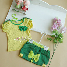 清仓夏款新装儿童套装韩版女童装黄色点点T恤+蝴蝶结短裙儿童套装