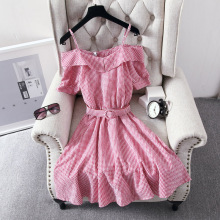 夏季女收腰吊带裙 2017新款韩版露肩一字领连衣裙 格子气质淑女裙