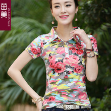 茁美2017夏季新款POLO衫女装修身迷彩花色印花短袖T恤女打底衫潮