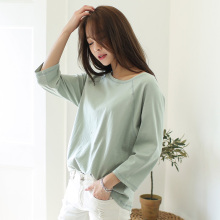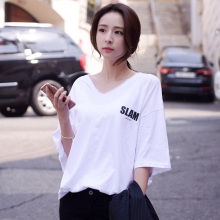 夏一字领七分袖t恤2017韩范女宽松大码百搭纯棉纯色打底衫学生