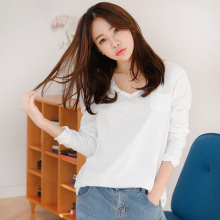 2017春季新款韩版大码女装纯色纯棉V领长袖T恤女宽松大码棉打底衫
